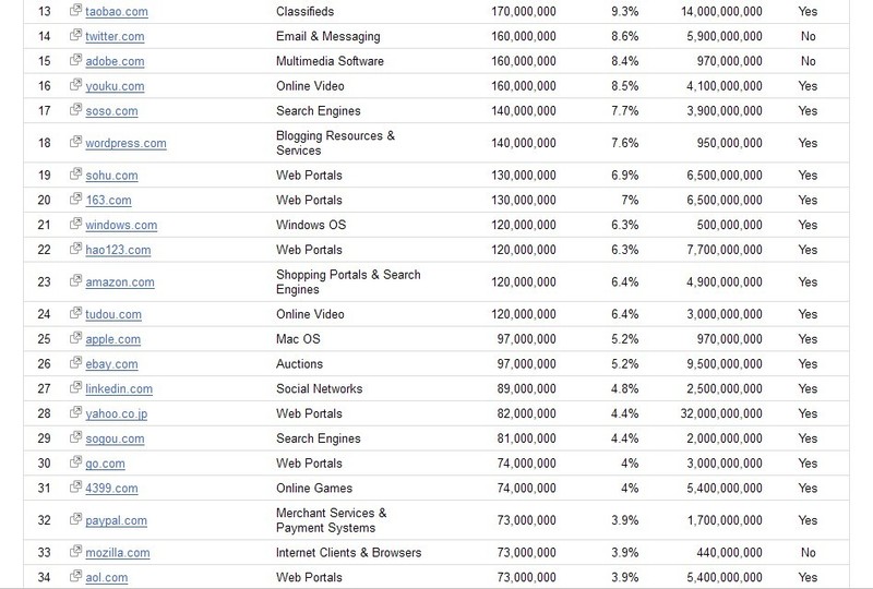 Google正式更新了全球排名前100名的網(wǎng)站排行版信息,國內(nèi)百度擠入第8名,獨立訪問量3.1億,QQ排名第10名,獨立訪問是 2.5億,F(xiàn)acebook穩(wěn)坐名獨立訪問量為8.7億,58同城上升到在第78位,姚建波在微博表示,爭取今年進(jìn)入全球前58名,相信對于國內(nèi)90%的站長來說還是個夢,繼續(xù)努力。